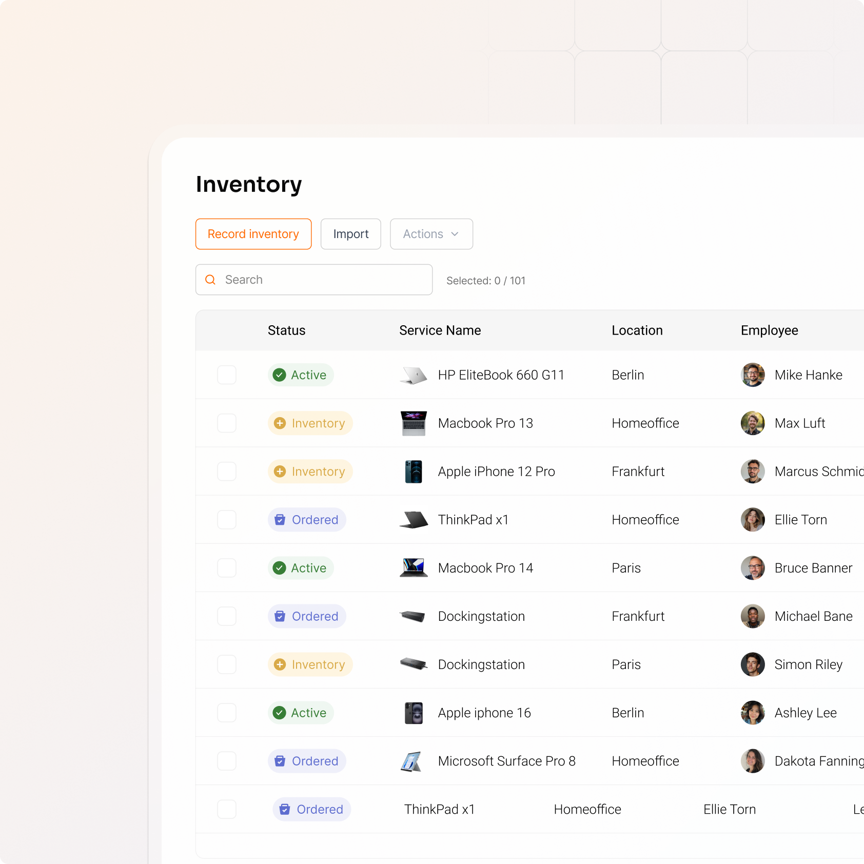 Laptops, software licenses, contracts, access rights & office equipment. One searchable source of truth for your entire inventory.