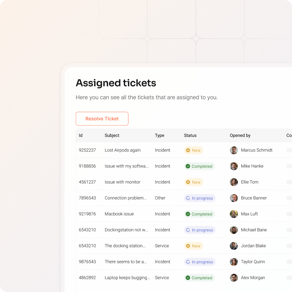 Asset context and ticket intelligence automatically route requests to the right person or external provider. No more bouncing between teams. Problems reach solutions faster.
