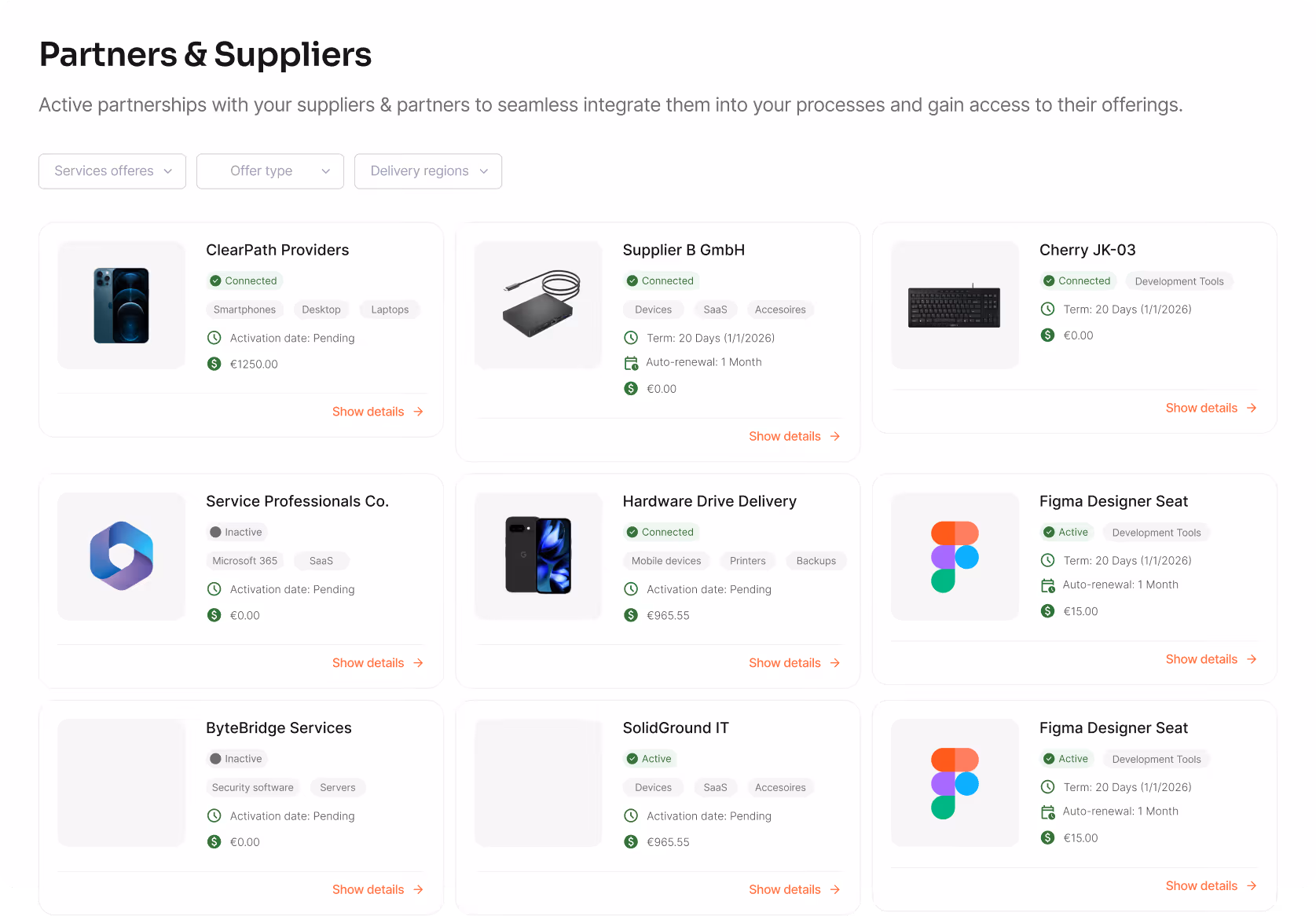 Instead of managing vendors across disconnected systems, invite your providers to equipme. Route orders automatically, track fulfillment in real-time, and handle support tickets with full context.