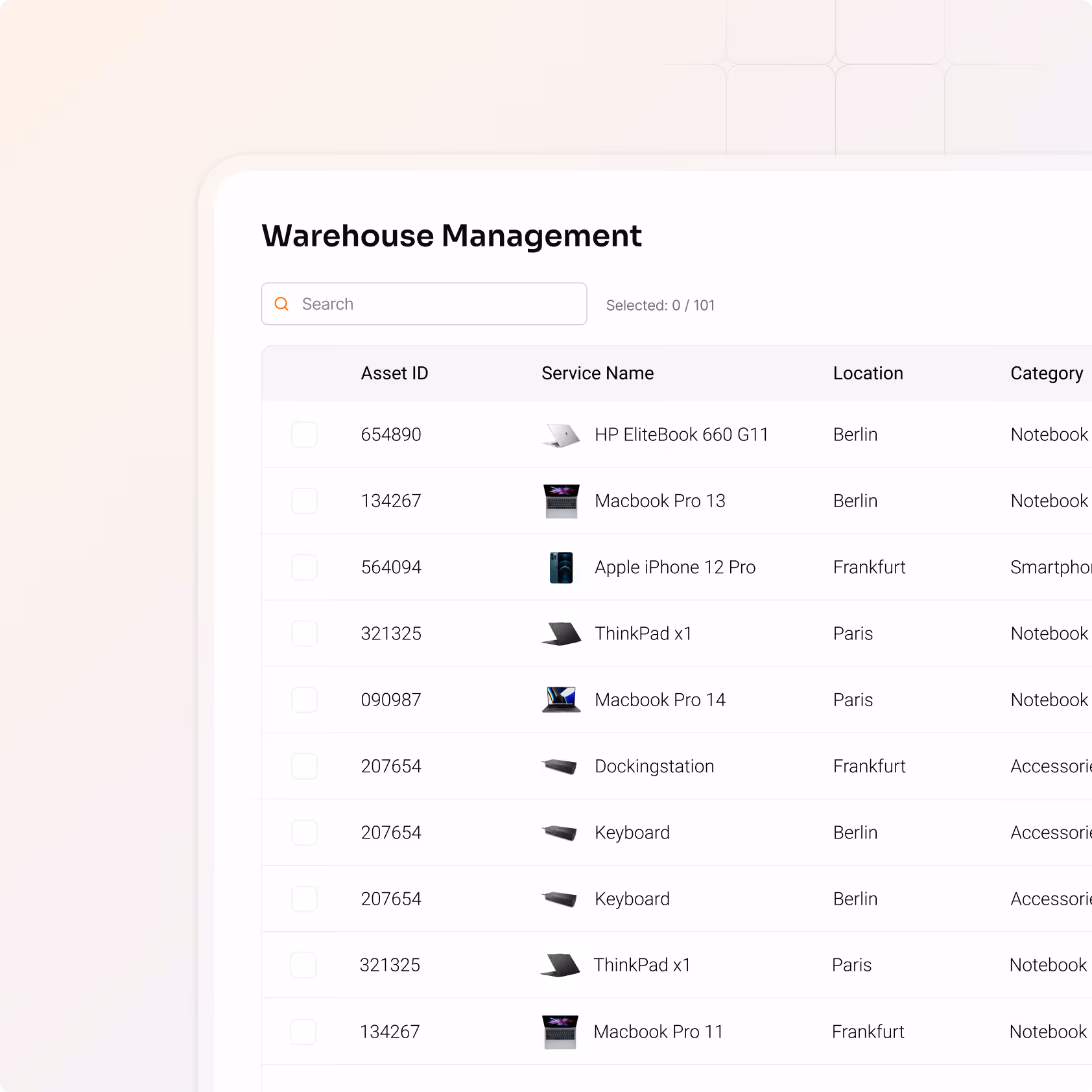 Laptops, software licenses, contracts, access rights & office equipment. One searchable source of truth for your entire inventory.
